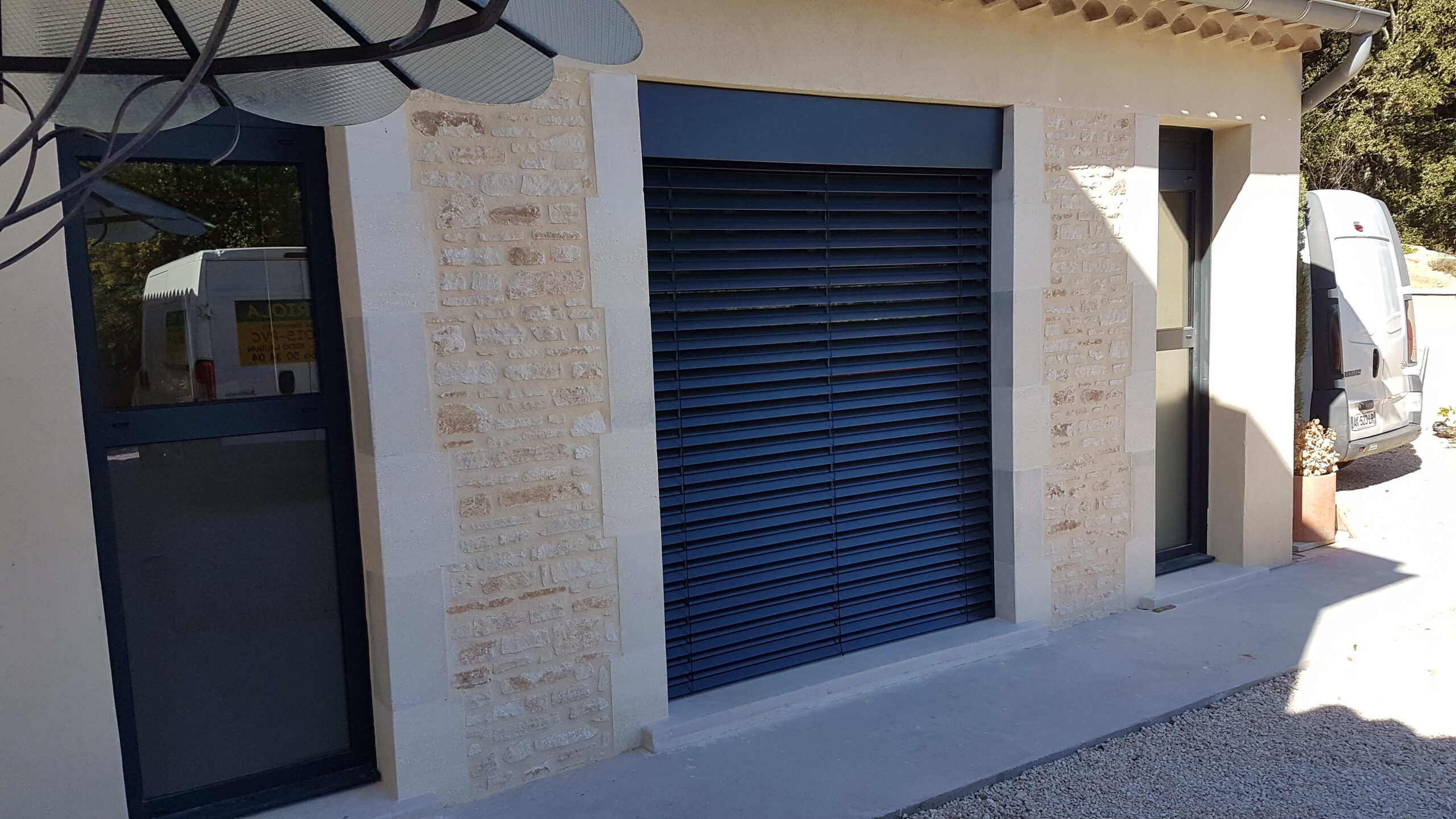 Fabrication et installation de menuiseries en Aluminium avec allège vitrage opaque et pose d’un brise soleil à lames orientables motorisées sur coulissant