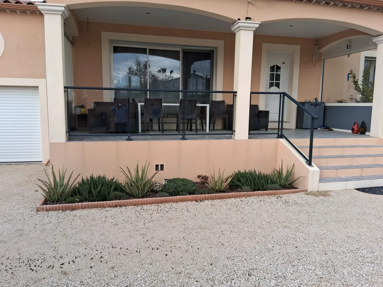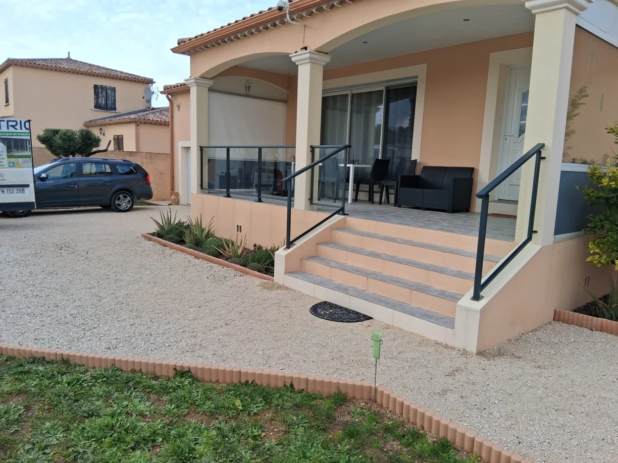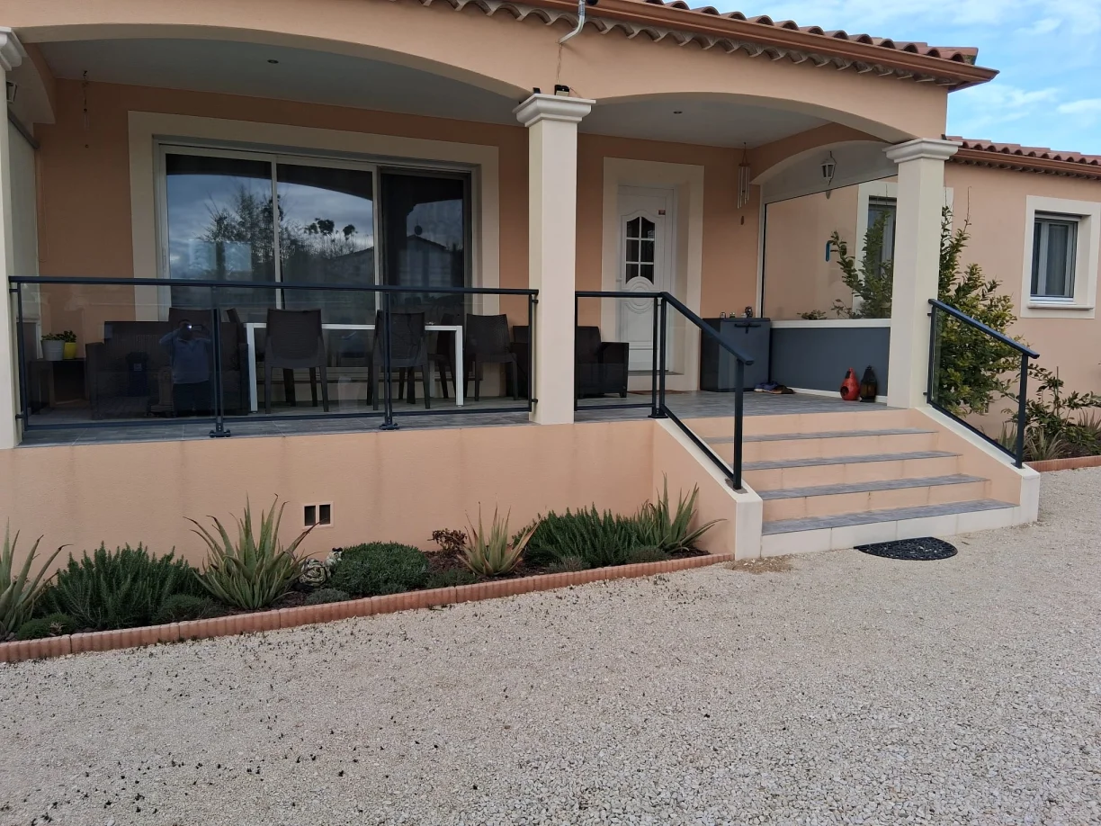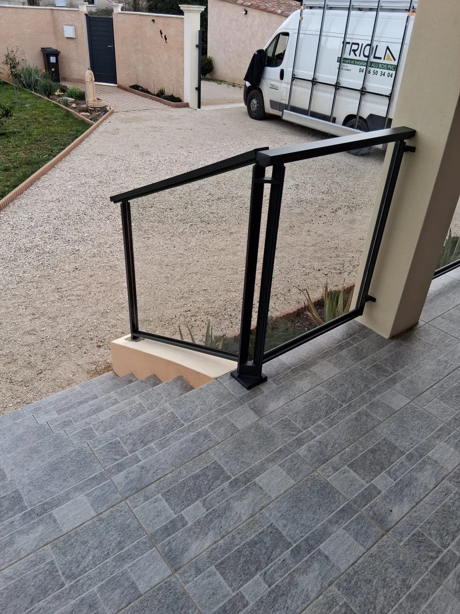 En février 2026, notre équipe TRIOLA Menuiseries est intervenue à Bagnols-sur-Cèze (Gard - 30) pour l’installation de garde-corps vitré avec structure aluminium RAL 7016.